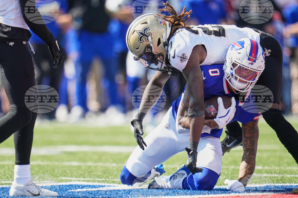 Buffalo Bills running back James Cook (4) is stopped near the goal line by New Orleans Saints safety Jonas Sanker in the first half of an NFL football game, Sunday, Sept. 28, 2025, in Orchard Park, N.Y. (AP Photo/Jeffrey T. Barnes)