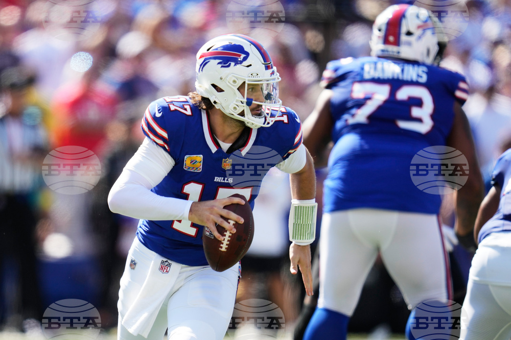 Buffalo Bills quarterback Josh Allen (17) runs onto the field before an NFL football game against the New Orleans Saints, Sunday, Sept. 28, 2025, in Orchard Park, N.Y. (AP Photo/Jeffrey T. Barnes)