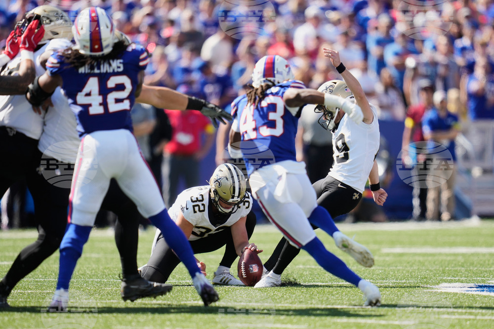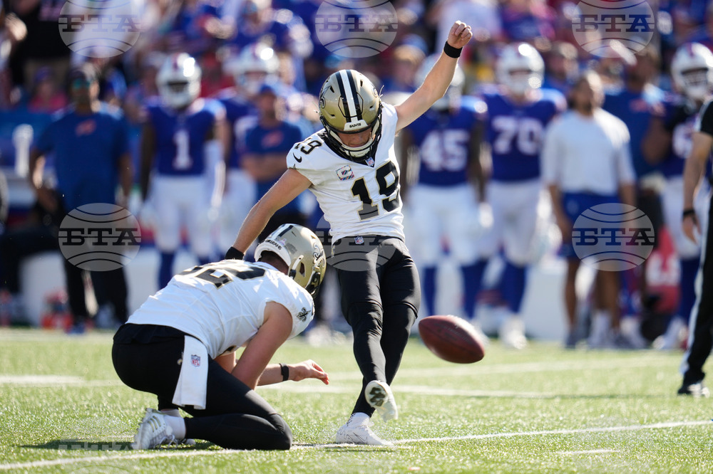New Orleans Saints kicker Blake Grupe (19) kicks a field goal in the second half of an NFL football game against the Buffalo Bills, Sunday, Sept. 28, 2025, in Orchard Park, N.Y. (AP Photo/Sue Ogrocki)