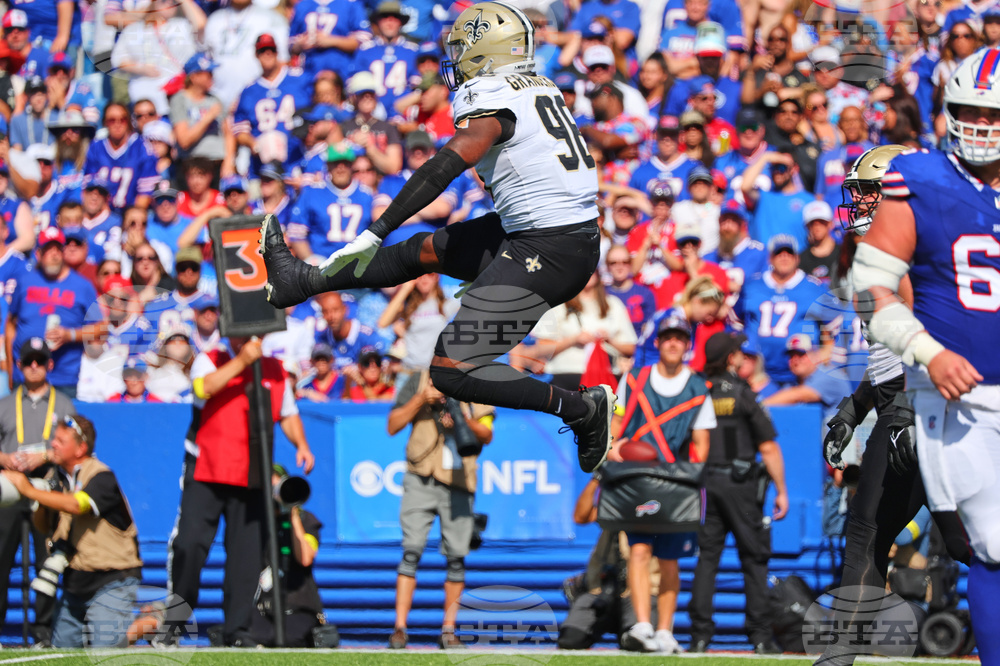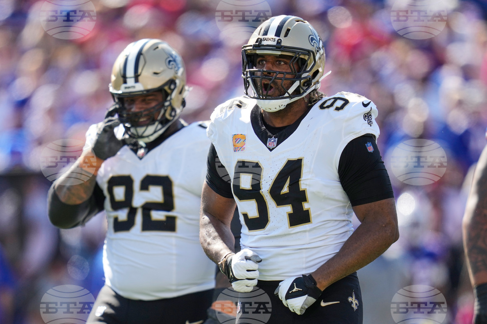 New Orleans Saints defensive end Cameron Jordan (94) celebrates his sack in the first half of an NFL football game against the Buffalo Bills, Sunday, Sept. 28, 2025, in Orchard Park, N.Y. (AP Photo/Sue Ogrocki)
