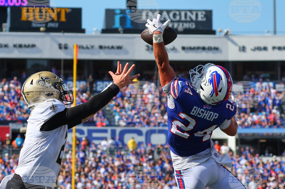 Buffalo Bills safety Cole Bishop (24) intercepts a pass intended for New Orleans Saints quarterback Spencer Rattler (2) on a trick play in the first half of an NFL football game, Sunday, Sept. 28, 2025, in Orchard Park, N.Y. (AP Photo/Jeffrey T. Barnes)