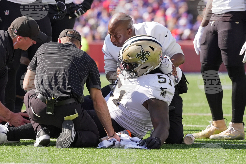 New Orleans Saints center Cesar Ruiz (51) is tended to after being injured in the first half of an NFL football game against the Buffalo Bills, Sunday, Sept. 28, 2025, in Orchard Park, N.Y. (AP Photo/Jeffrey T. Barnes)