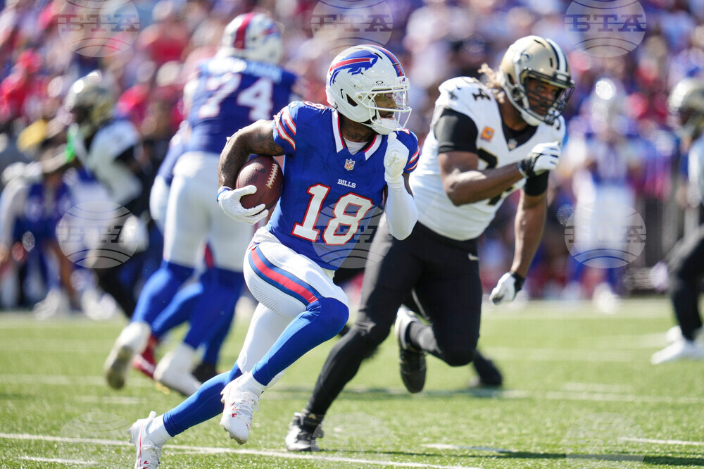 Buffalo Bills wide receiver Elijah Moore (18) carries in the first half of an NFL football game against the New Orleans Saints, Sunday, Sept. 28, 2025, in Orchard Park, N.Y. (AP Photo/Sue Ogrocki)