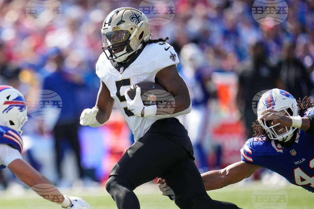 New Orleans Saints running back Alvin Kamara (41) carries against the Buffalo Bills in the second half of an NFL football game, Sunday, Sept. 28, 2025, in Orchard Park, N.Y. (AP Photo/Sue Ogrocki)
