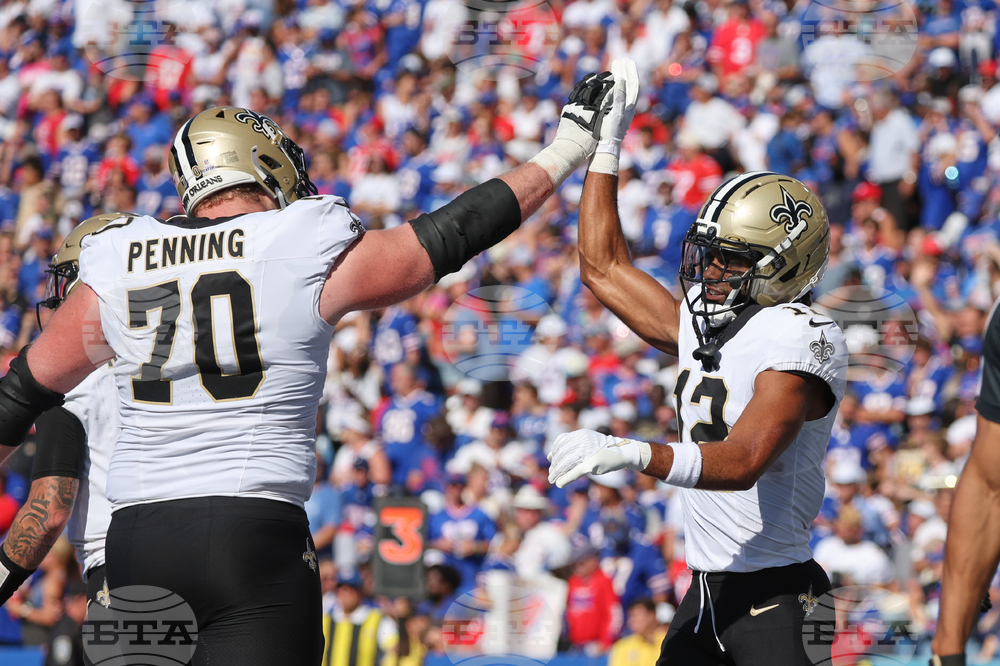 New Orleans Saints wide receiver Chris Olave (12) celebrates his touchdown reception with offensive tackle Trevor Penning (70) in the second half of an NFL football game against the Buffalo Bills, Sunday, Sept. 28, 2025, in Orchard Park, N.Y. (AP Photo/Jeffrey T. Barnes)