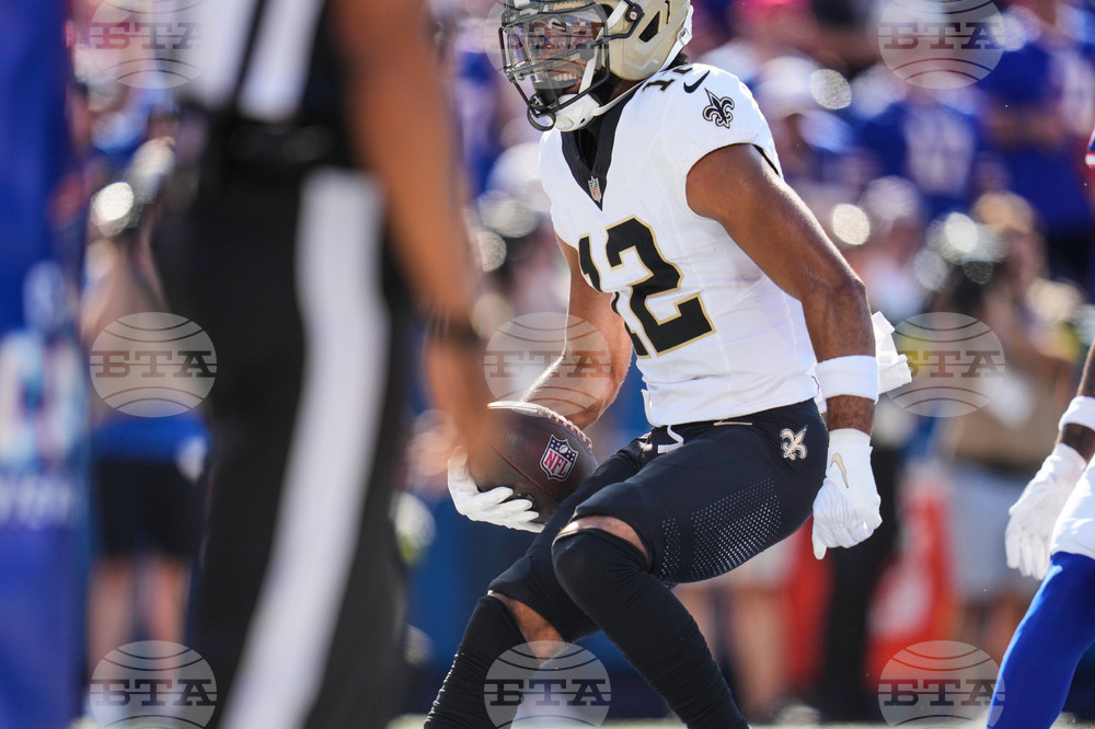 New Orleans Saints wide receiver Chris Olave (12) reacts after his touchdown reception in the second half of an NFL football game against the Buffalo Bills, Sunday, Sept. 28, 2025, in Orchard Park, N.Y. (AP Photo/Jeffrey T. Barnes)