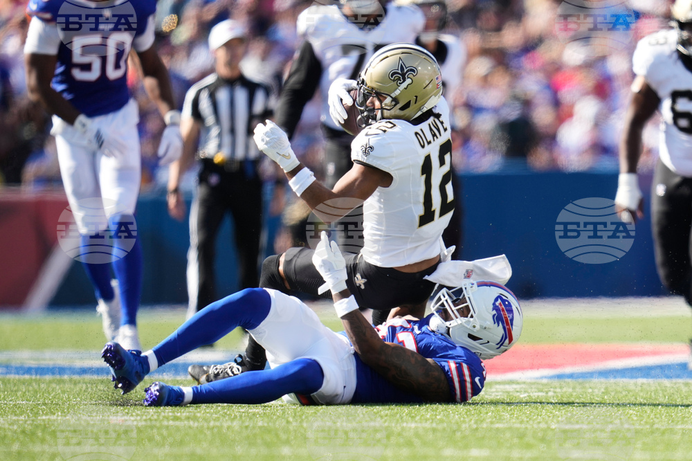 New Orleans Saints wide receiver Chris Olave (12) is tackled by Buffalo Bills cornerback Christian Benford in the second half of an NFL football game, Sunday, Sept. 28, 2025, in Orchard Park, N.Y. (AP Photo/Sue Ogrocki)