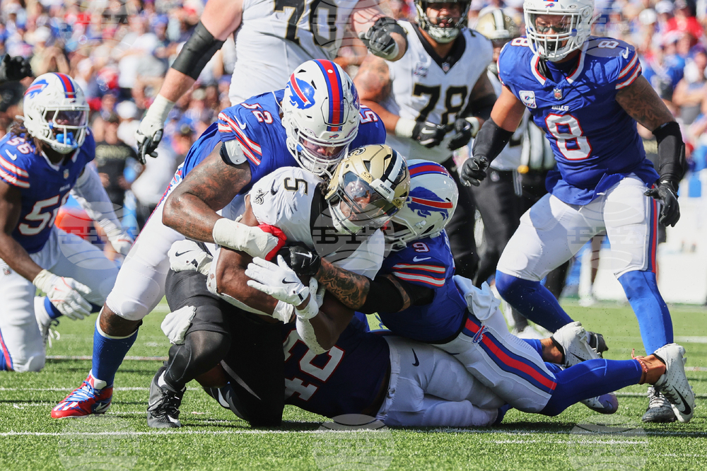 New Orleans Saints running back Kendre Miller (5) is tackled by Buffalo Bills linebacker Dorian Williams and safety Taylor Rapp (9) in the second half of an NFL football game, Sunday, Sept. 28, 2025, in Orchard Park, N.Y. (AP Photo/Jeffrey T. Barnes)
