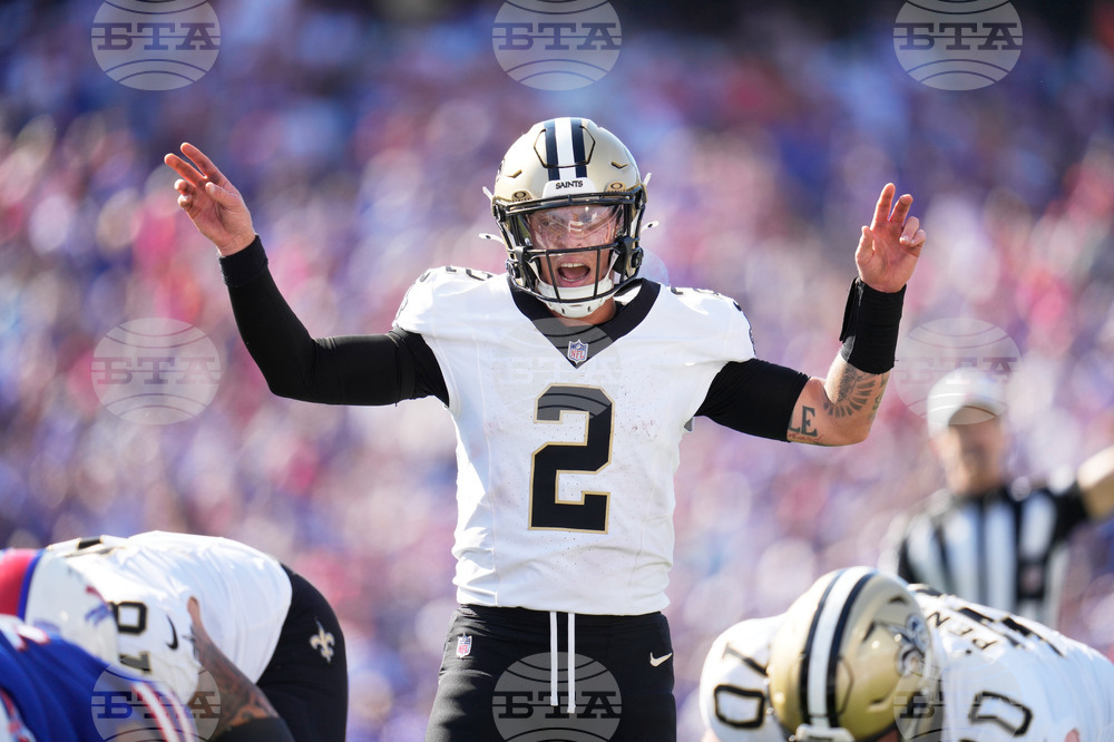 New Orleans Saints quarterback Spencer Rattler (2) calls out at the line of scrimmage in the second half of an NFL football game against the Buffalo Bills, Sunday, Sept. 28, 2025, in Orchard Park, N.Y. (AP Photo/Sue Ogrocki)