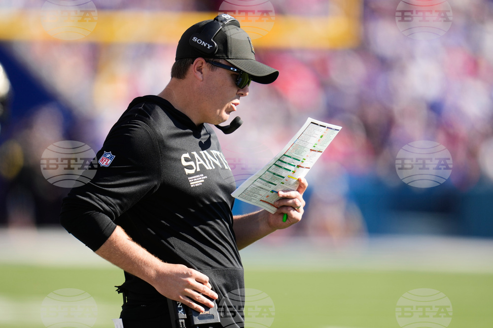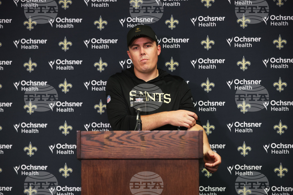New Orleans Saints head coach Kellen Moore talks to reporters after an NFL football game against the Buffalo Bills, Sunday, Sept. 28, 2025, in Orchard Park, N.Y. (AP Photo/Jeffrey T. Barnes)