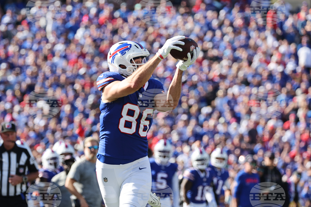 Buffalo Bills tight end Dalton Kincaid (86) pulls in a touchdown pass against the New Orleans Saints in the second half of an NFL football game, Sunday, Sept. 28, 2025, in Orchard Park, N.Y. (AP Photo/Jeffrey T. Barnes)