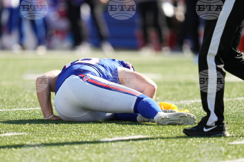 Buffalo Bills Cameron Johnston wears a knee brace after coming onto the field to hold for kicker Matt Prater in the second half of an NFL football game, Sunday, Sept. 28, 2025, in Orchard Park, N.Y. (AP Photo/Sue Ogrocki)