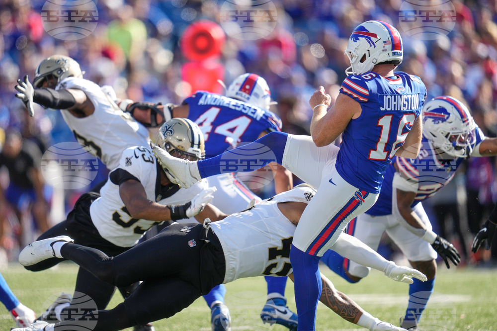 New Orleans Saints linebacker Nephi Sewell (45) hits Buffalo Bills punter Cameron Johnston (16) in the second half of an NFL football game, Sunday, Sept. 28, 2025, in Orchard Park, N.Y. (AP Photo/Sue Ogrocki)