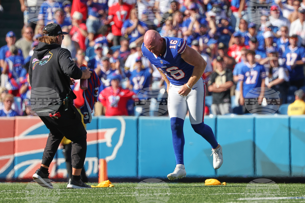 Buffalo Bills punter Cameron Johnston (16) reacts after being hit in the second half of an NFL football game against the New Orleans Saints, Sunday, Sept. 28, 2025, in Orchard Park, N.Y. (AP Photo/Jeffrey T. Barnes)