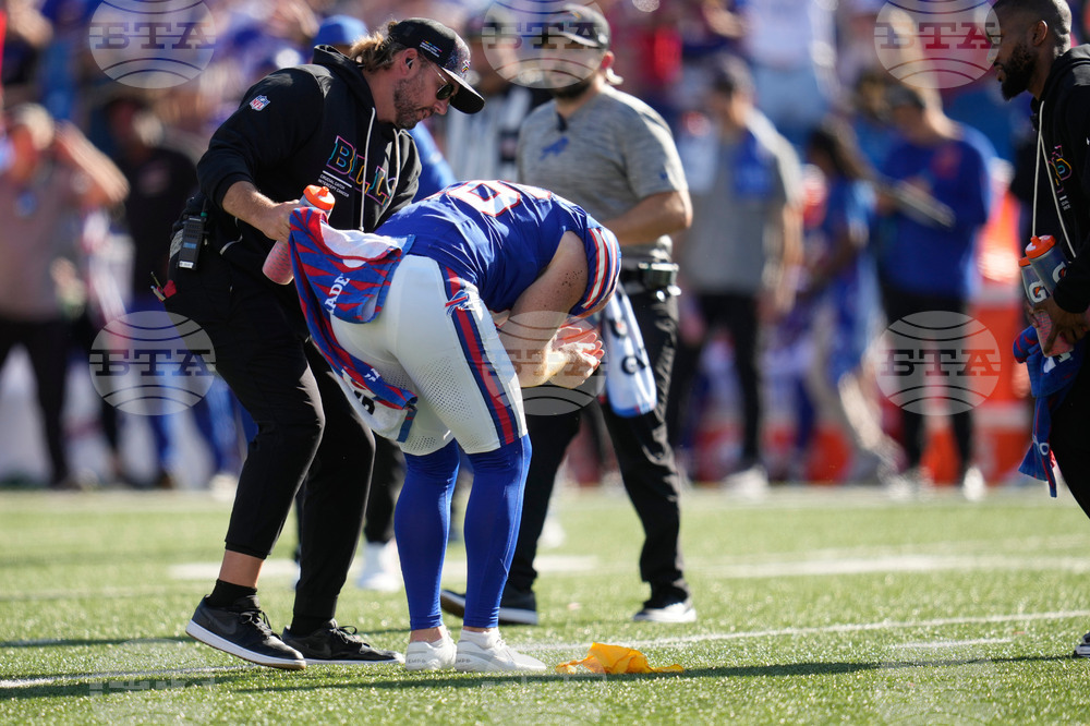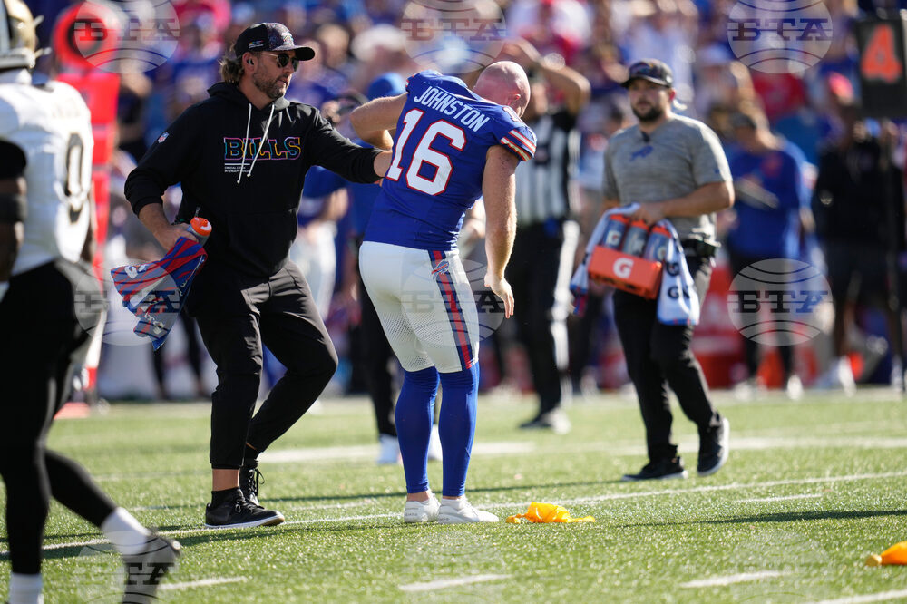 Buffalo Bills punter Cameron Johnston (16) is helped after being hit in the second half of an NFL football game against the New Orleans Saints, Sunday, Sept. 28, 2025, in Orchard Park, N.Y. (AP Photo/Sue Ogrocki)