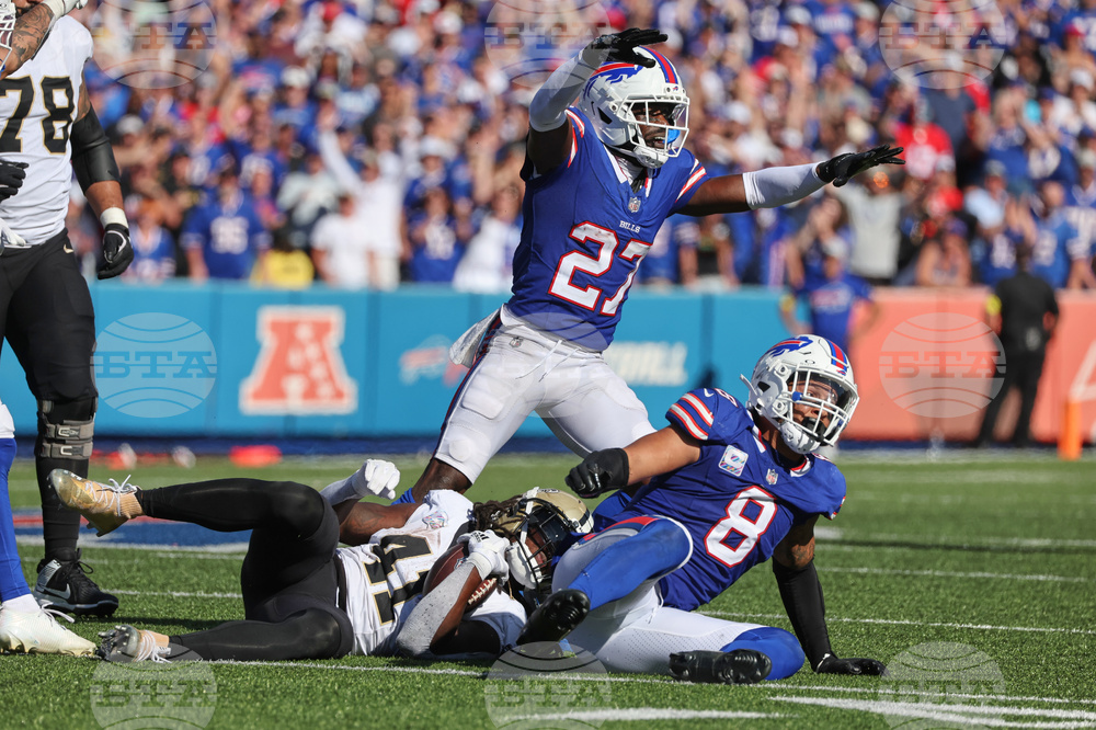 Buffalo Bills cornerback Tre'Davious White (27) and linebacker Terrel Bernard (8) celebrate after stopping New Orleans Saints running back Alvin Kamara (41) on fourth down in the second half of an NFL football game, Sunday, Sept. 28, 2025, in Orchard Park, N.Y. (AP Photo/Jeffrey T. Barnes)