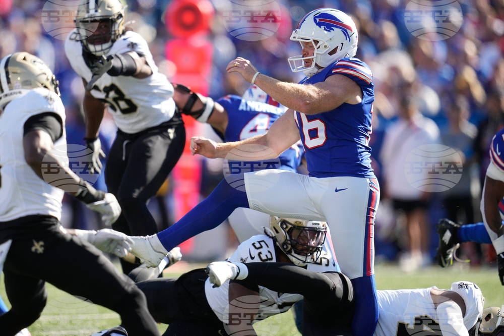Buffalo Bills punter Cameron Johnston (16) is hit in the leg by New Orleans Saints linebacker Nephi Sewell in the second half of an NFL football game, Sunday, Sept. 28, 2025, in Orchard Park, N.Y. (AP Photo/Sue Ogrocki)