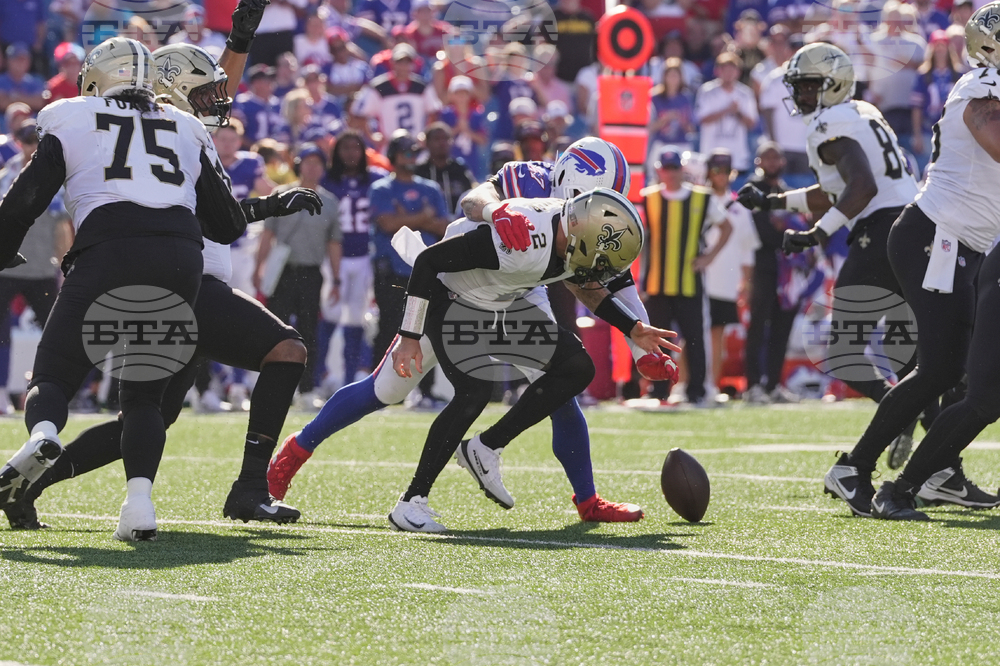 New Orleans Saints quarterback Spencer Rattler (2) fumbles as he is hit by Buffalo Bills defensive end AJ. Epenesa (57) in the second half of an NFL football game, Sunday, Sept. 28, 2025, in Orchard Park, N.Y. (AP Photo/Sue Ogrocki)