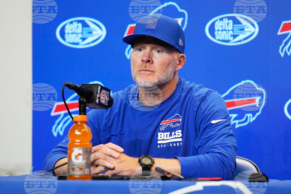 Buffalo Bills head coach Sean McDermott talks to reporters after an NFL football game against the New Orleans Saints, Sunday, Sept. 28, 2025, in Orchard Park, N.Y. (AP Photo/Sue Ogrocki)