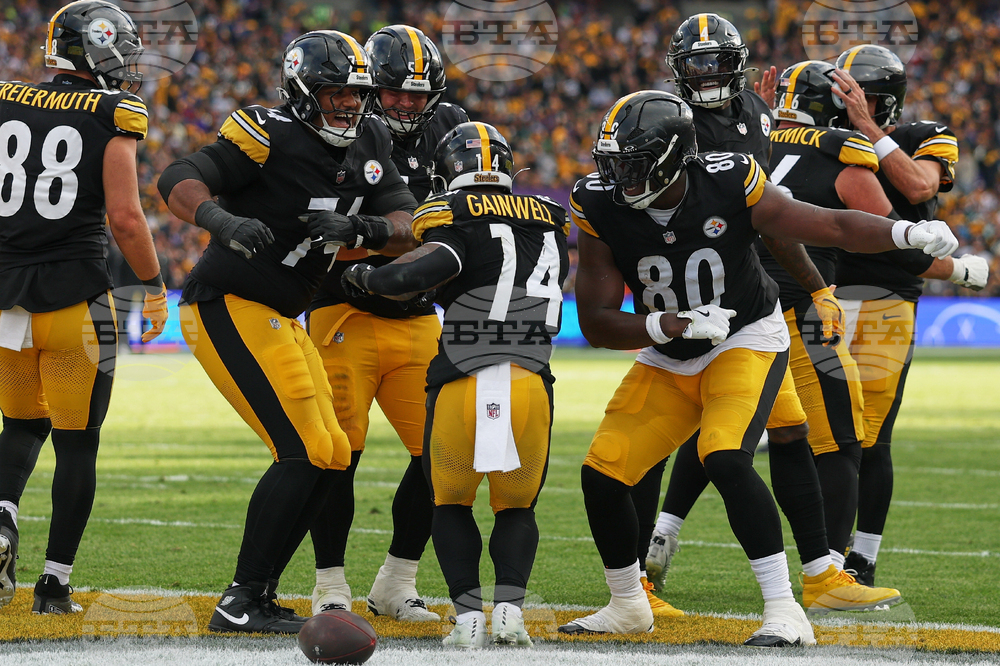 Steelers players celebrate scoring a touchdown during the NFL football game between Minnesota Vikings and Pittsburgh Steelers at Croke Park stadium in Dublin, Sunday, Sept. 28, 2025.(AP Photo/Ian Walton)