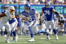 New York Giants quarterback Jaxson Dart (6) calls an audible at the line of scrimmage against the Los Angeles Chargers during the first quarter of an NFL football game, Sunday, Sept. 28, 2025, in East Rutherford, N.J. (AP Photo/Yuki Iwamura)
