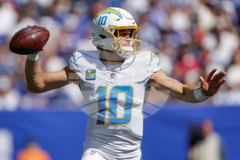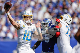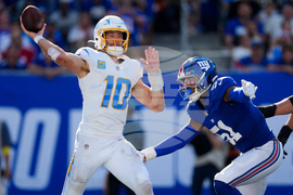Los Angeles Chargers quarterback Justin Herbert (10) passes against the New York Giants during the first quarter of an NFL football game, Sunday, Sept. 28, 2025, in East Rutherford, N.J. (AP Photo/Adam Hunger)
