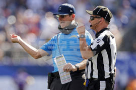 Los Angeles Chargers head coach Jim Harbaugh talks with side judge Jim Quirk (5) during the second quarter of an NFL football game, Sunday, Sept. 28, 2025, in East Rutherford, N.J. (AP Photo/Adam Hunger)