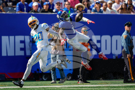 New York Giants wide receiver Malik Nabers (1) leaps for a pass against Los Angeles Chargers cornerback Cam Hart (20) during the second quarter of an NFL football game, Sunday, Sept. 28, 2025, in East Rutherford, N.J. (AP Photo/Yuki Iwamura)