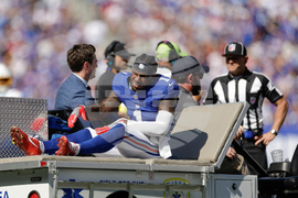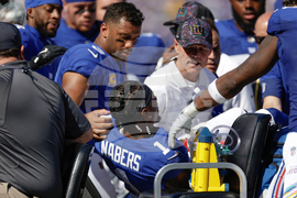 New York Giants wide receiver Malik Nabers (1) is driven off the field by medical personnel after an injury during the second quarter of an NFL football game against the Los Angeles Chargers, Sunday, Sept. 28, 2025, in East Rutherford, N.J. (AP Photo/Yuki Iwamura)