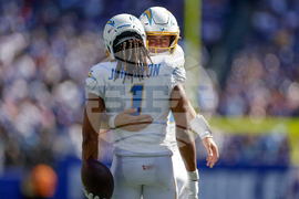 Los Angeles Chargers quarterback Justin Herbert congratulates wide receiver Quentin Johnston (1) after Johnston scored a touchdown against the New York Giants during the second quarter of an NFL football game, Sunday, Sept. 28, 2025, in East Rutherford, N.J. (AP Photo/Adam Hunger)