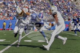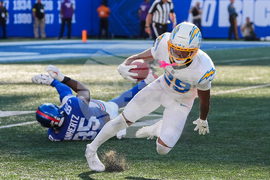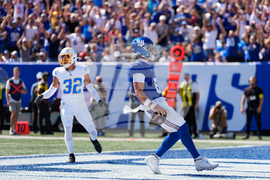Los Angeles Chargers wide receiver Quentin Johnston (1) crosses the goal line for a touchdown against New York Giants safety Dane Belton (24) during the second quarter of an NFL football game, Sunday, Sept. 28, 2025, in East Rutherford, N.J. (AP Photo/Yuki Iwamura)