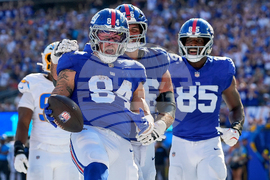 New York Giants tight end Theo Johnson (84) celebrates after scoring a touchdown against the Los Angeles Chargers during the third quarter of an NFL football game, Sunday, Sept. 28, 2025, in East Rutherford, N.J. (AP Photo/Yuki Iwamura)