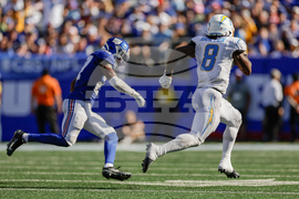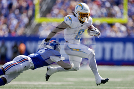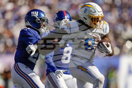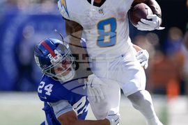 Los Angeles Chargers running back Omarion Hampton (8) carries the ball against New York Giants cornerback Deonte Banks (2) during the second quarter of an NFL football game, Sunday, Sept. 28, 2025, in East Rutherford, N.J. (AP Photo/Adam Hunger)