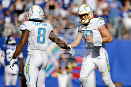 Los Angeles Chargers running back Omarion Hampton (8) is congratulated by quarterback Justin Herbert (10) after scoring a touchdown against the New York Giants during the third quarter of an NFL football game, Sunday, Sept. 28, 2025, in East Rutherford, N.J. (AP Photo/Adam Hunger)