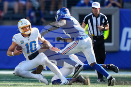 Los Angeles Chargers quarterback Justin Herbert (10) is sacked by the New York Giants during the fourth quarter of an NFL football game, Sunday, Sept. 28, 2025, in East Rutherford, N.J. (AP Photo/Yuki Iwamura)
