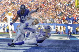 Los Angeles Chargers wide receiver Quentin Johnston (1) make a touchdown catch against New York Giants safety Dane Belton (24) and cornerback Deonte Banks (2) during the second quarter of an NFL football game, Sunday, Sept. 28, 2025, in East Rutherford, N.J. (AP Photo/Adam Hunger)