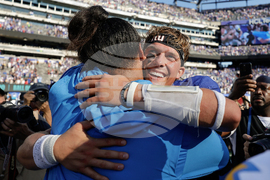 Los Angeles Chargers head coach Jim Harbaugh congratulates Los Angeles Chargers wide receiver Quentin Johnston (1) after Johnston scored a touchdown against the New York Giants during the second quarter of an NFL football game, Sunday, Sept. 28, 2025, in East Rutherford, N.J. (AP Photo/Adam Hunger)