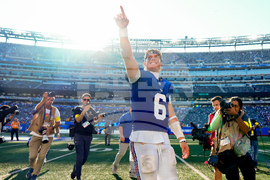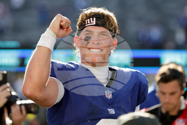 New York Giants quarterback Jaxson Dart (6) reacts after defeating the Los Angeles Chargers in an NFL football game, Sunday, Sept. 28, 2025, in East Rutherford, N.J. (AP Photo/Yuki Iwamura)
