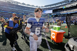 New York Giants quarterback Jaxson Dart (6) walks off the field after defeating the Los Angeles Chargers in an NFL football game, Sunday, Sept. 28, 2025, in East Rutherford, N.J. (AP Photo/Adam Hunger)