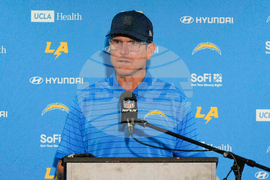 Los Angeles Chargers head coach Jim Harbaugh answers questions during a news conference after an NFL football game against the New York Giants, Sunday, Sept. 28, 2025, in East Rutherford, N.J. (AP Photo/Yuki Iwamura)