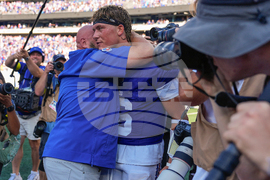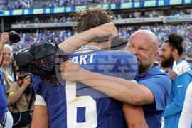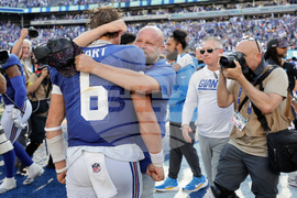 New York Giants quarterback Jaxson Dart (6) gets a hug from head coach Brian Daboll after the Giants defeated the Los Angeles Chargers in an NFL football game, Sunday, Sept. 28, 2025, in East Rutherford, N.J. (AP Photo/Yuki Iwamura)