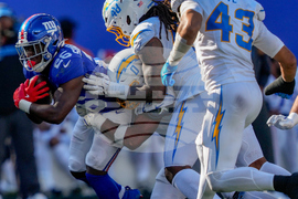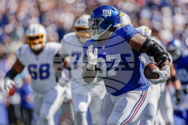 New York Giants running back Devin Singletary (26) carries the bal against the Los Angeles Chargers during the fourth quarter of an NFL football game, Sunday, Sept. 28, 2025, in East Rutherford, N.J. (AP Photo/Yuki Iwamura)