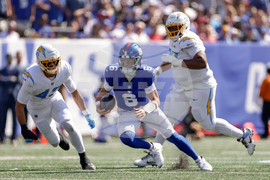 New York Giants quarterback Jaxson Dart (6) is tackled by Los Angeles Chargers cornerback Cam Hart (20) and linebacker Daiyan Henley (0) during the third quarter of an NFL football game, Sunday, Sept. 28, 2025, in East Rutherford, N.J. (AP Photo/Adam Hunger)