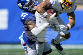 New York Giants safety Tyler Nubin (27) tackles Los Angeles Chargers tight end Tyler Conklin (83) during the first quarter of an NFL football game, Sunday, Sept. 28, 2025, in East Rutherford, N.J. (AP Photo/Yuki Iwamura)