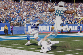 New York Giants tight end Theo Johnson (84) crosses the goal line for a touchdown against the Los Angeles Chargers during the third quarter of an NFL football game, Sunday, Sept. 28, 2025, in East Rutherford, N.J. (AP Photo/Adam Hunger)