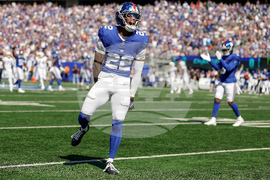 New York Giants cornerback Andru Phillips (22) reacts after a defensive play against the Los Angeles Chargers during the first quarter of an NFL football game, Sunday, Sept. 28, 2025, in East Rutherford, N.J. (AP Photo/Adam Hunger)