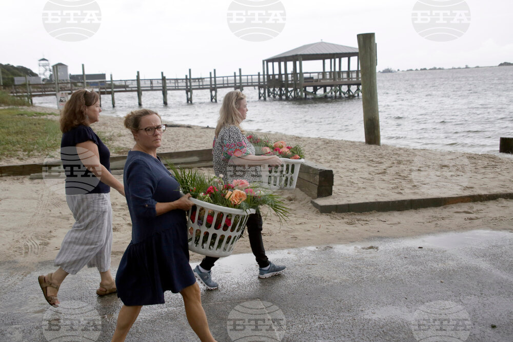 People bring baskets of flowers to place in front of the American Fish Company following a fatal shooting that occurred here the night before, Sunday, Sept. 28, 2025, in Southport, N.C. (AP Photo/Chris Seward)
