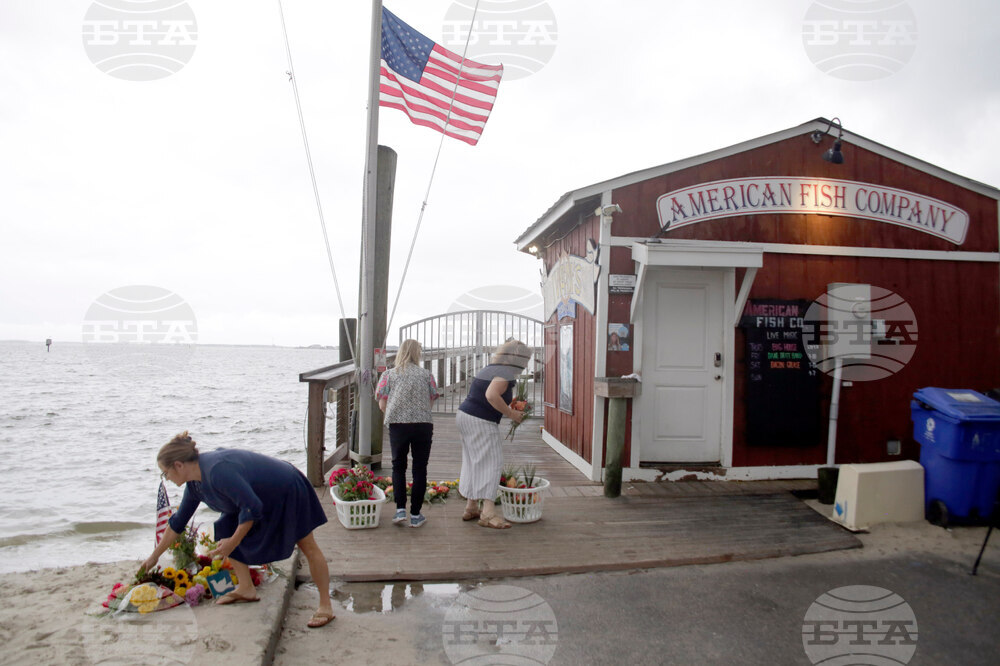 People place flowers in front of the American Fish Company following a fatal shooting that occurred the night before, Sunday, Sept. 28, 2025, in Southport, N.C. (AP Photo/Chris Seward)