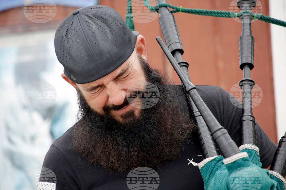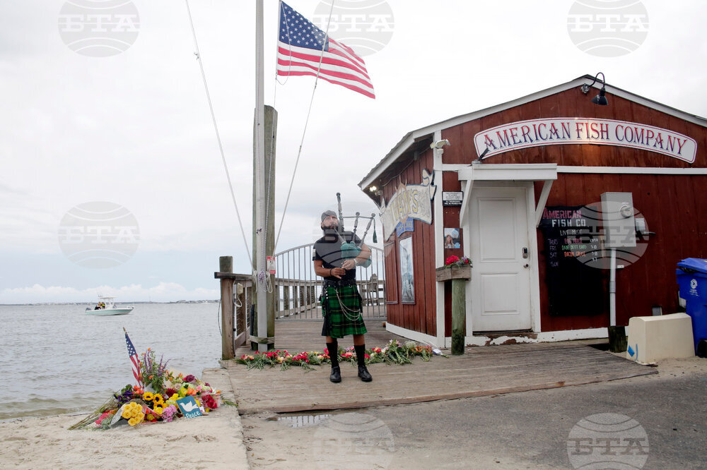 Joey Whitaker from Holden Beach plays "Amazing Grace" on the bagpipes in front of the American Fish Company following a fatal shooting that occurred here the night before, Sunday, Sept. 28, 2025, in Southport, N.C. (AP Photo/Chris Seward)