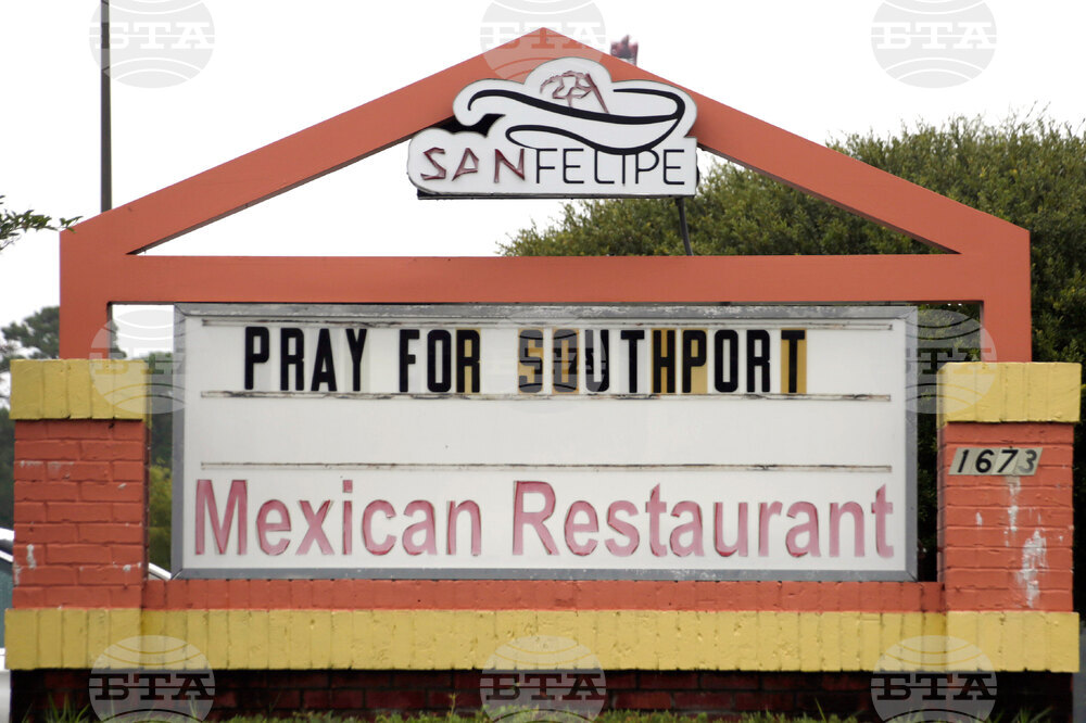 A sign on a Mexican restaurant asks people to "Pray for Southport," following a fatal shooting that occurred at he American Fish Company in the town the night before, Sunday, Sept. 28, 2025, in Southport, N.C. (AP Photo/Chris Seward)